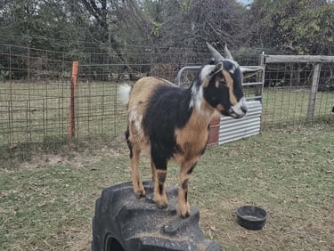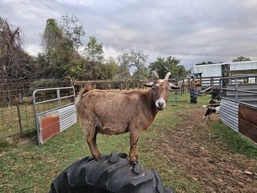 Waffles is Peaches daughter, when she was born she got an infection in her eye and now only sees from one eye, she doesn't let that stop her from thinking she is a circus goat